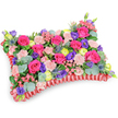 Presenting our elegant pillow-shaped flower ensemble, a perfect fusion of beauty and sophistication. This luxurious bouquet features a stunning combination of roses, carnations, ranunculus, lisianthus, bouvardia, accented with eucalyptus leaves and ruscus, ideal for expressing deep emotions and honoring loved ones.