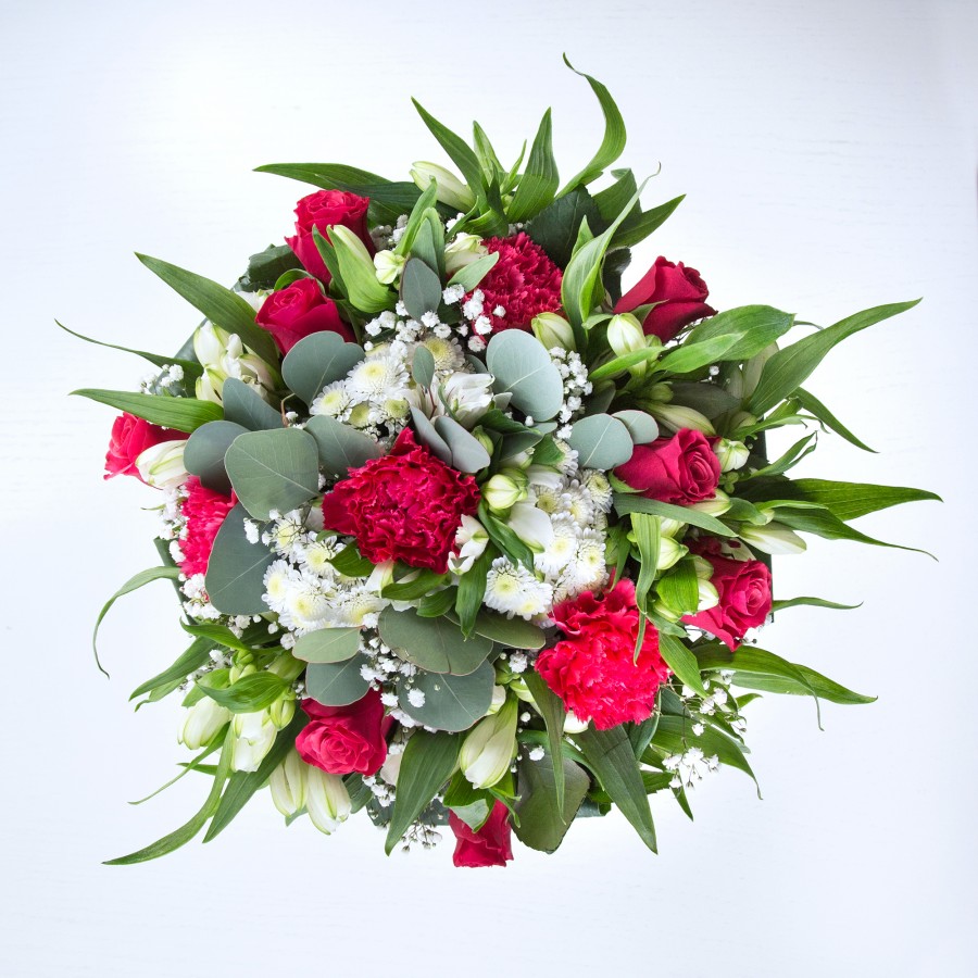 Our beautiful bouquet showcases the harmonious blend of red roses and white chrysanthemums, complemented by carnations, gypsophila, and lush aspidistra leaves. Each flower is carefully chosen for maximum freshness and visual appeal.