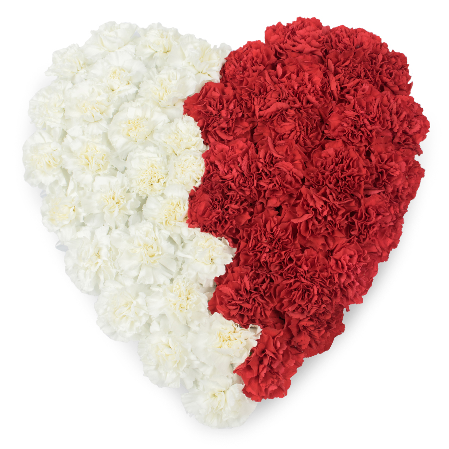 Express your love with our romantic heart-shaped carnation bouquet, elegantly designed by Handy Flowers. This captivating arrangement features a harmonious blend of white and red carnations, perfect for any romantic occasion.